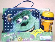 サリーのランチバッグ (MI0303) ケースの横幅約31cm。水筒はふたを回すとストローが出てくるタイプの物です。サリーの目が動きます。他にマイクのランチバッグもあります。 |